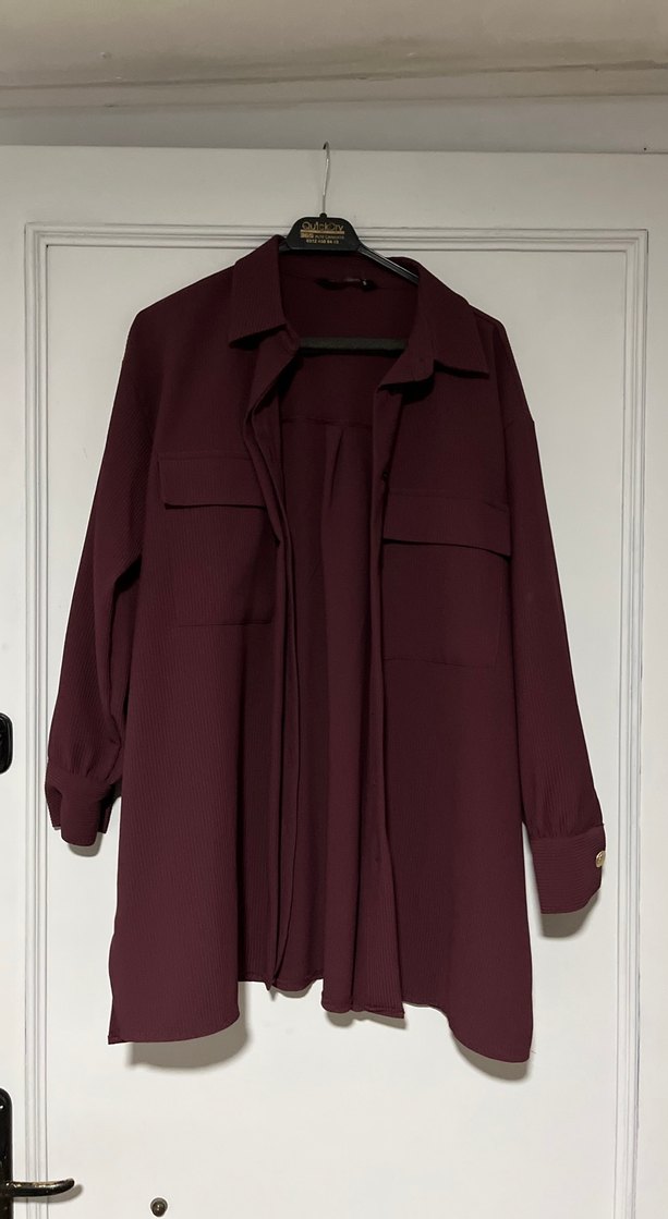 Bordo renkli, uzun kollu, düğmeli ve yakalı kadın gömleği. Rahat kesimi ve sentetik kumaşıyla ofis kullanımı için uygun. Takım olarak