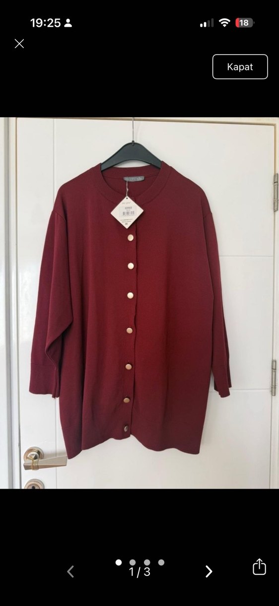 Bordo renkli yün hırka, yuvarlak yaka ve uzun kolludur. Düğmeli ve normal midi boyda, rahat ve gündelik kullanıma uygundur.