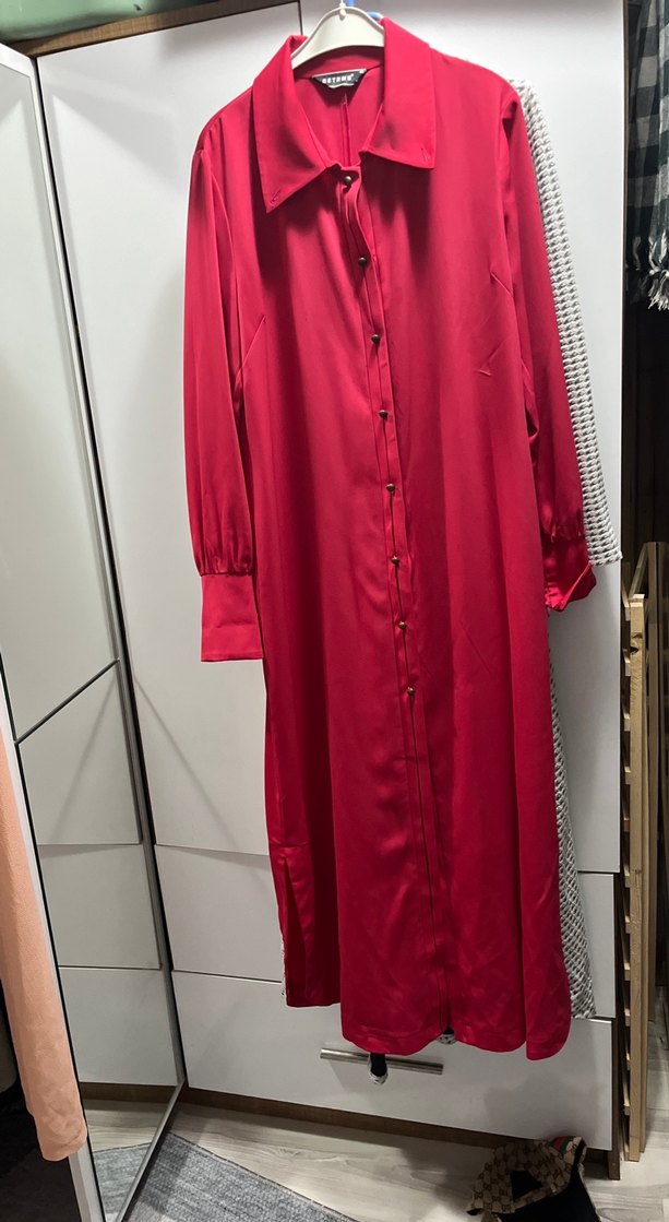 Bordo, parlak ve ipeksi kumaştan uzun, düğmeli ve bol kesim kadın tunik. Notlu yaka ve uzun kollu, Paris sokak modası ve ofis şıklığını birleştirir.