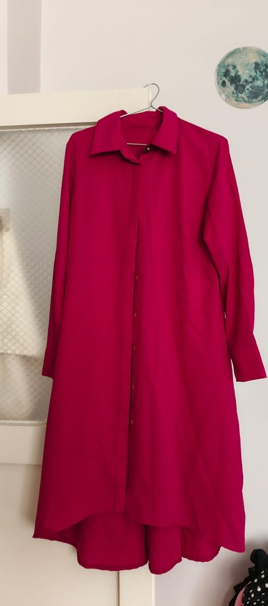 Bordo renkli, uzun boylu, düğmeli kadın tunik. İpek gibi dokuda, geniş kesim ve uzun kollu, ofis için uygun bir model. ✨ Ufak tefek hataları son görsellerde mevcut belli belirsizdir