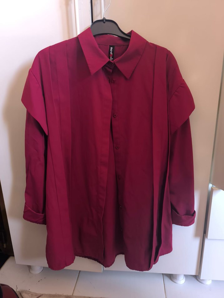 Bordo renk, keten kumaştan uzun kollu, düğmeli ve yakalı gömlek. Salaş kesimi ve normal boyu ile günlük sokak stili için uygundur. ✨