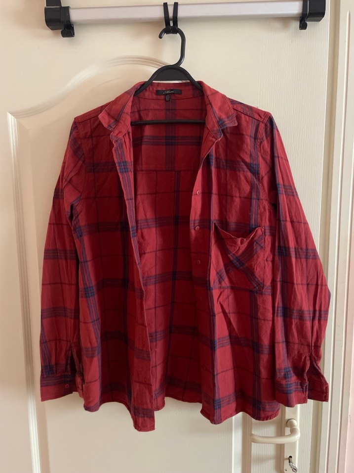 Bordo renkli, uzun kollu, düğmeli ve salaş kesim gömlek. Yakalı ve kare desenli, günlük rahat kullanıma uygun.