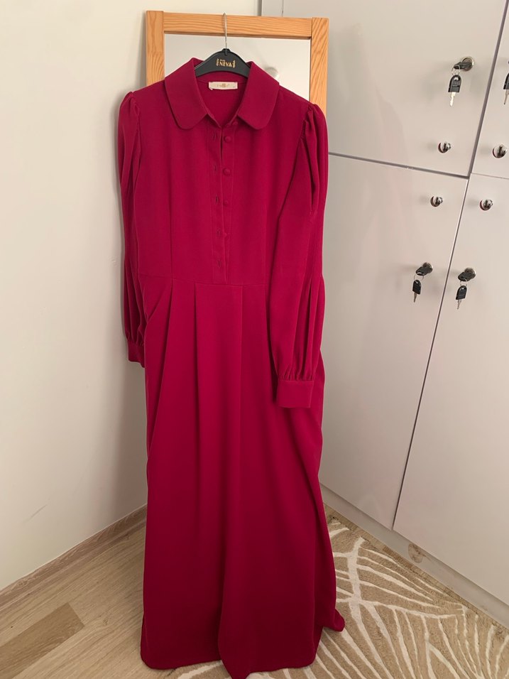 Bordo renkte, yakalı ve uzun kollu, düğmeli, bol kesim uzun elbisedir. Yumuşak sentetik kumaştan üretilmiş olup ofis kullanımına uygundur.