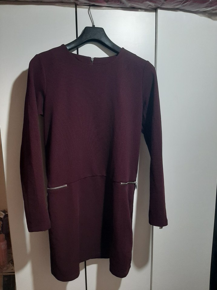 Bordo renk, uzun kollu ve bisiklet yakalı, beli fermuar detaylı, yumuşak ve sıcak dokulu elbise. Günlük kullanım için uygundur. Arkası fermuarlıdır. Fermuarını açıp kapatırken biraz zorluk çıkarıyordur.