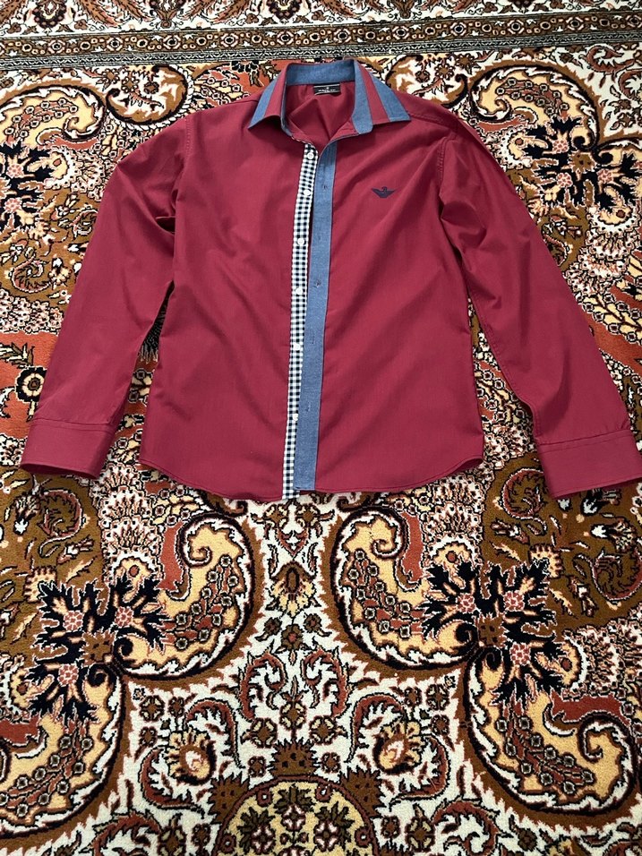 Uzun kollu, yakalı ve düğmeli bordo erkek gömleği. Sentetik kumaştan, regular fit ve normal boyda, günlük ve sokak stili için uygun.