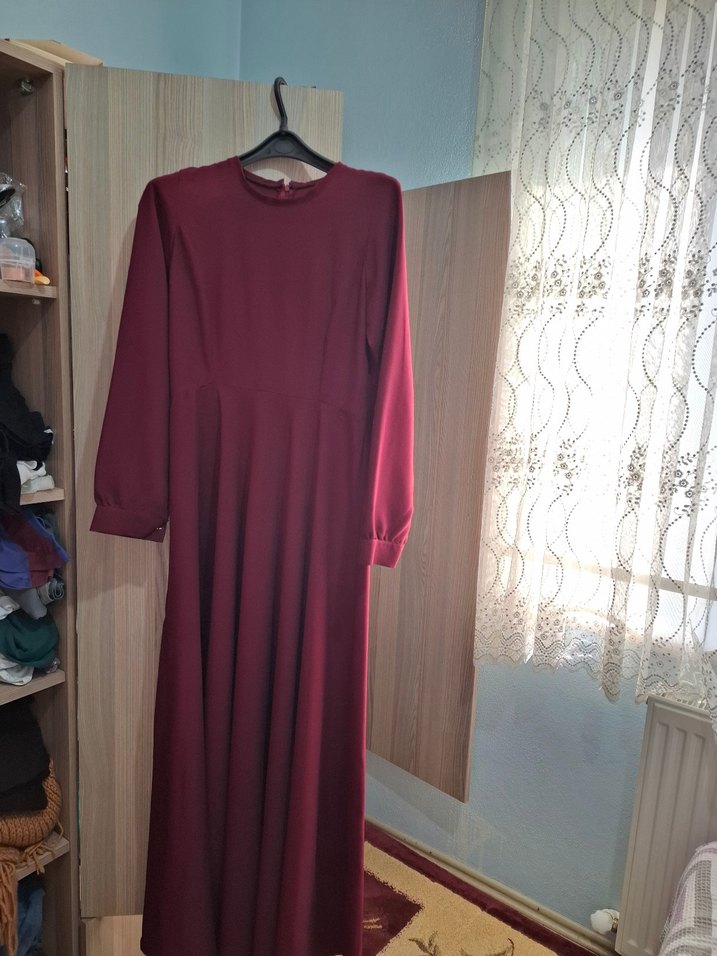 Bordo renkte, uzun kollu ve yuvarlak yakalı bu elbise, salaş kesimi ve drapeli detaylarıyla modern klasik tarz sunar. Hafif sentetik kumaştan üretilmiştir. bir kaç dikiş sökükleri var 42 bedene uyumlu dar geldiği için satıyorum
