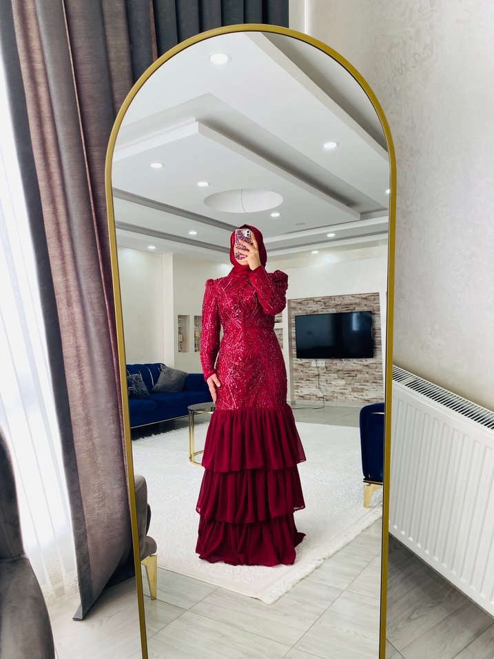 Bordo renkli, yüksek yakalı ve uzun kollu, baskılı desenli abiye elbise. Normal kalıplı ve etek kısmında kat kat fırfırlar bulunur. Düğün için uygun. ✨