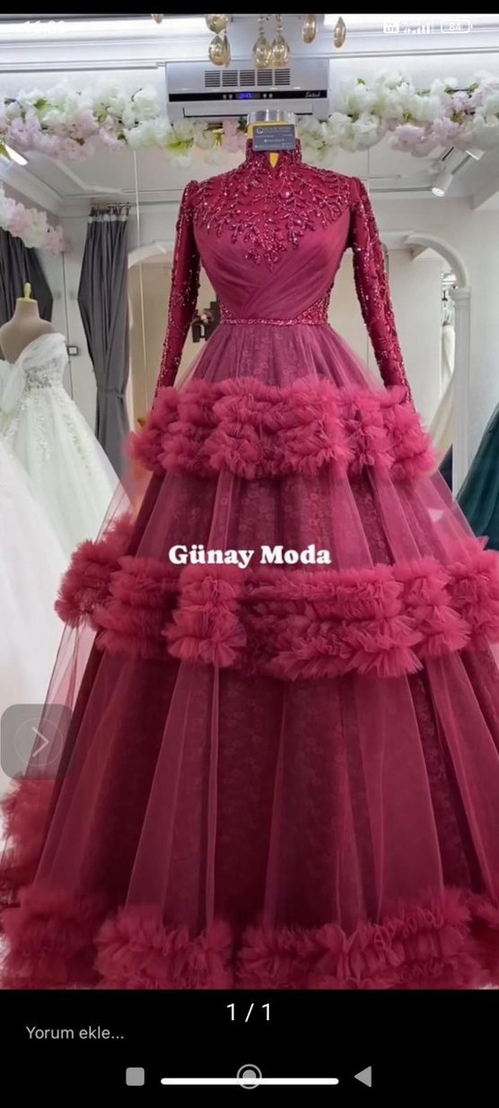 Bordo renkte, uzun kollu ve straplez yaka detaylı, fırfır süslemeli, desenli kumaştan yapılmış klasik ve modern kesim abiye elbisedir. Günay Moda markasıdır.