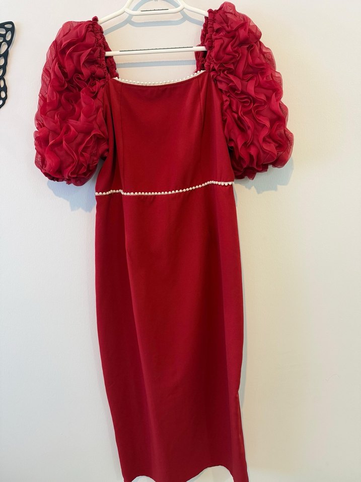 Bordo renkli, fırfırlı kabarık kollara sahip, straplez yakalı ve vücuda oturan kesim modern klasik abiye elbise. İşlemeli detaylarıyla düğün için uygundur. ✨ az kullanılmış tertemiz ürünüm güzel günlerde kullanın :)