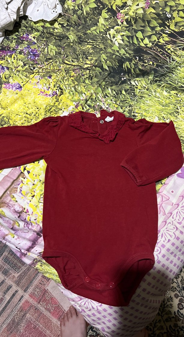 Bordo uzun kollu, yakalı ve fırfır detaylı bebek body. Yumuşak ve rahat kumaş. Serin günler için uygun.