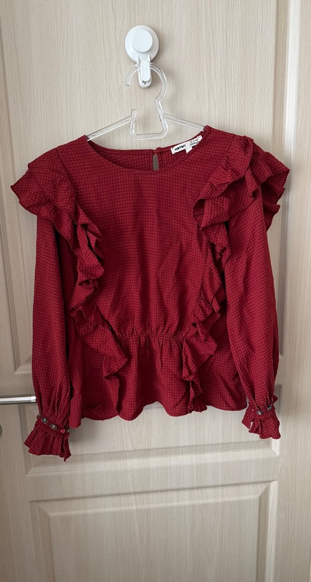 Bordo renk, uzun kollu, fırfır detaylı, yuvarlak yaka ve bol kesim bluz. Koyu tie-dye deseni ve sentetik dokusu günlük bohem tarz için uygundur.