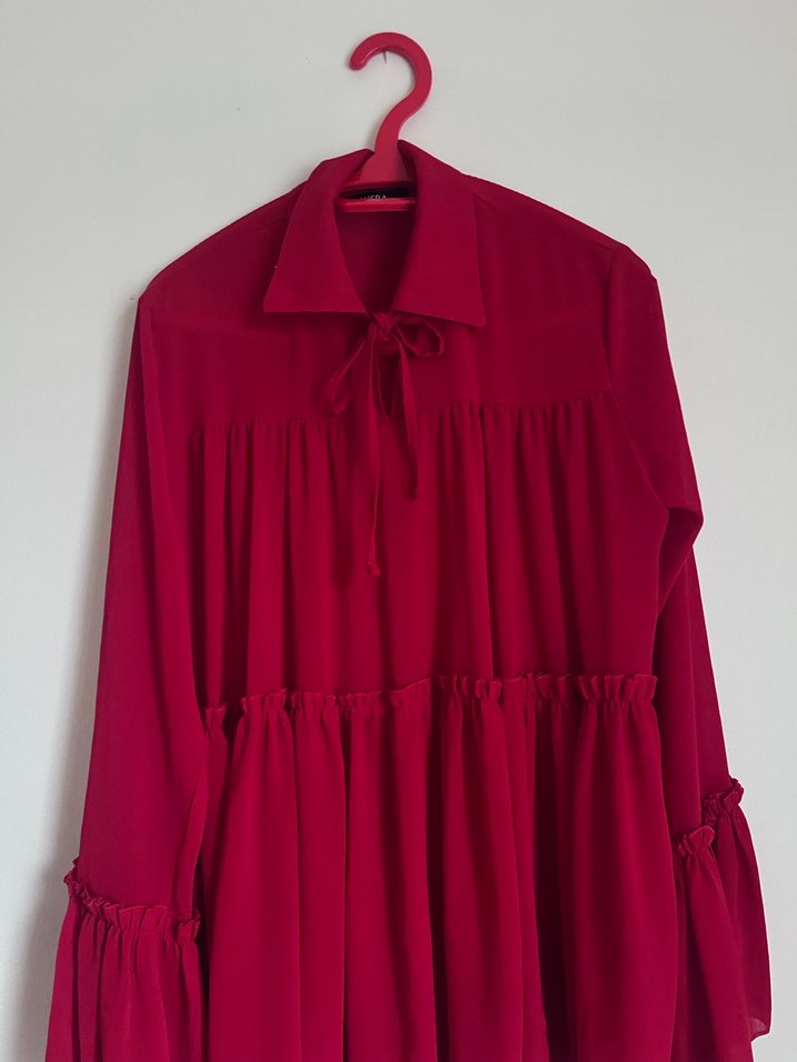 Bordo renkli uzun kollu, bol kesim ve fırfır detaylı bu tunik, yumuşak sentetik kumaştan üretilmiş olup bohem tarzına uygundur.