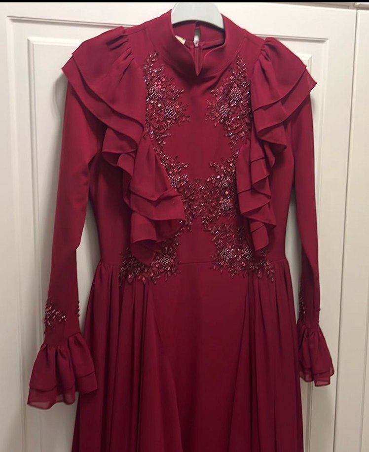 Bordo renkli, uzun kollu ve yüksek yakalı bu abiye elbise, işlemeli detaylar ve fırfırlarla klasik ve modern bir şıklık sunar. Yalnızca bir kez giyildi