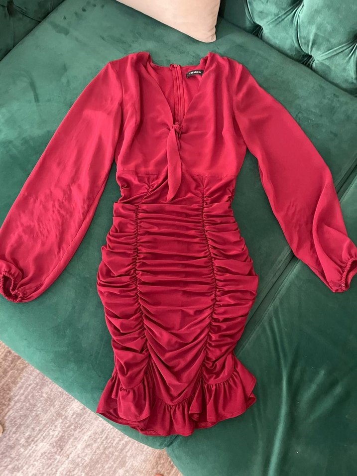 Bordo renkli, uzun kollu, V yakalı, vücuda oturan bu abiye elbise, büzgülü etek ve fırfır detaylarıyla modern ve iddialı bir görünüm sunar.
