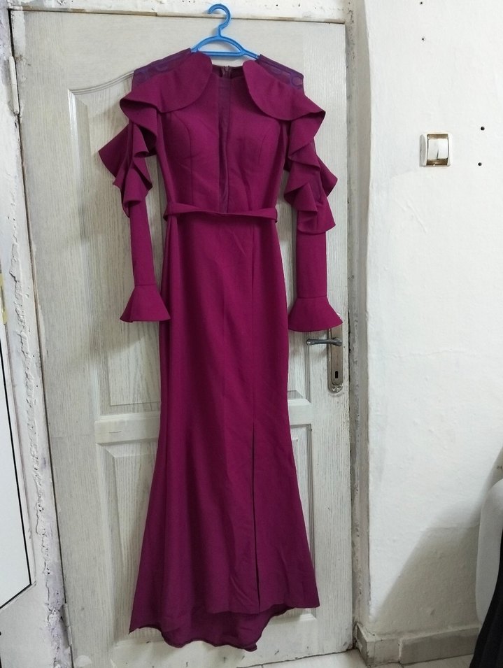 Bordo Uzun Kollu Fırfırlı Kadın Abiye Elbise renk mürdüm rengi