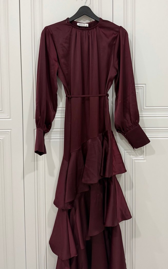 Bordo renkli, yuvarlak yakalı ve bol kesim uzun elbise, ipeksi kumaş ve fırfır detaylarıyla klasik bir şıklık sunar. Uzun kolları ofis için uygundur. 140 cm dir