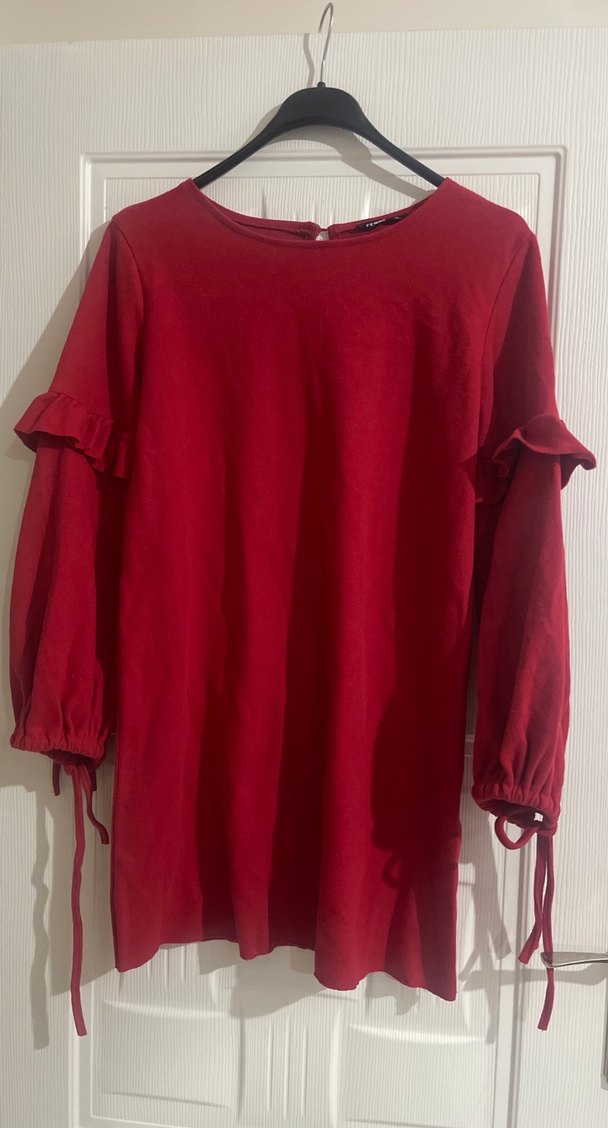 Bordo keten kumaştan, uzun kollu ve fırfırlı detaylı, bol kesim midi boy tunik.elbise olarakta kullanılır sorunsuz