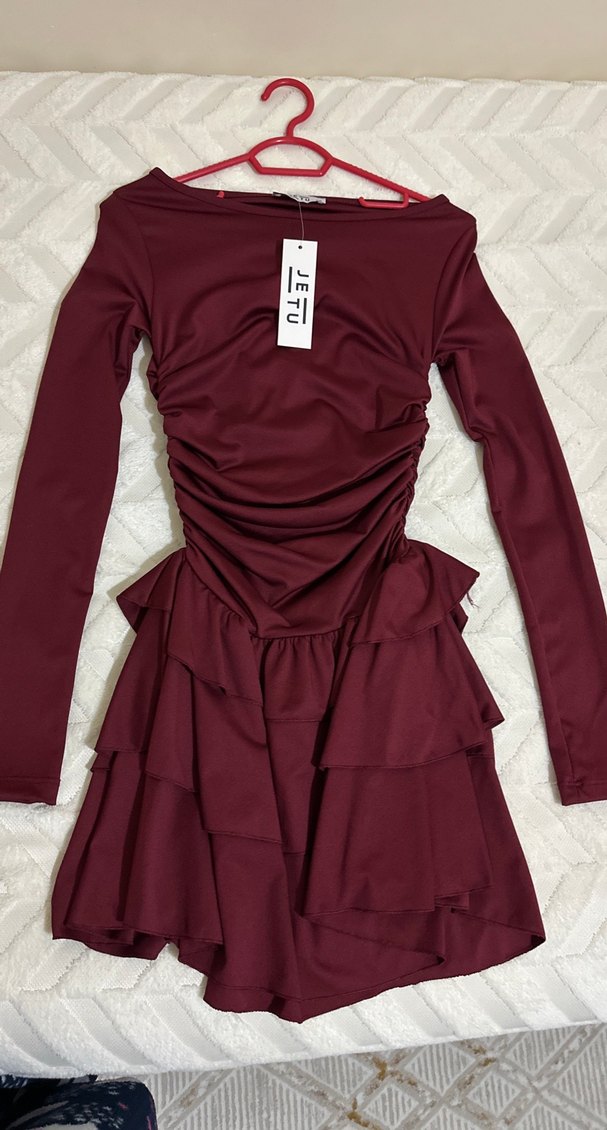 Bordo renkli, uzun kollu, straplez yaka ve fırfır detaylı mini elbise, romantik gece için uygun. Marka: JETU.