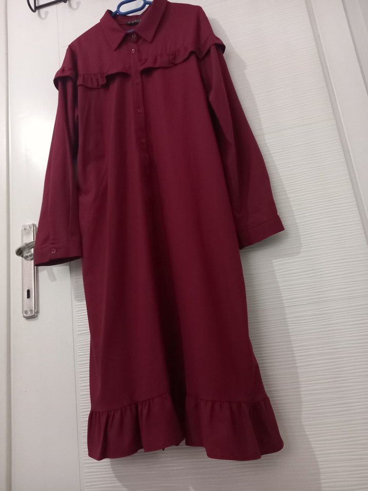 Bordo uzun kollu tunik, yakalı ve fırfır detaylıdır. Rahat kesim ve sentetik kumaştan yapılmıştır, ofis için uygundur. kaside markadır. 42 beden. 2 kere giyildi tertemiz. rengi biraz açık çıkmış fotoğraflarda güzel bordodur rengi.