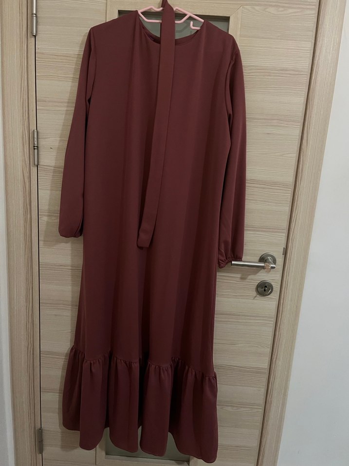 Pembe renkli, yüksek yakalı ve uzun kollu, bol kesim uzun elbisedir. Etek kısmında fırfır detayları bulunur, yumuşak sentetik kumaştandır.