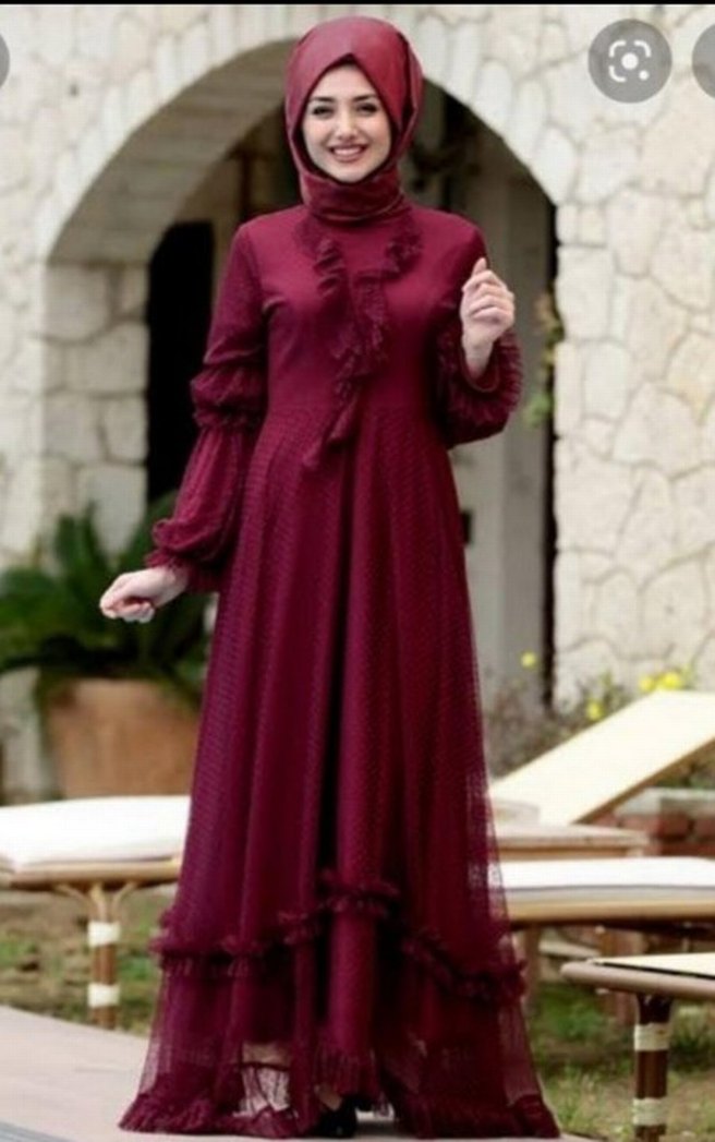 Bordo renkli, yüksek yakalı ve uzun kollu, fırfır detaylı uzun elbise. Yumuşak sentetik kumaştan, salaş kesim ve hafif batik desenlidir, mütevazı düğünler için uygun. sıfır ayarında.