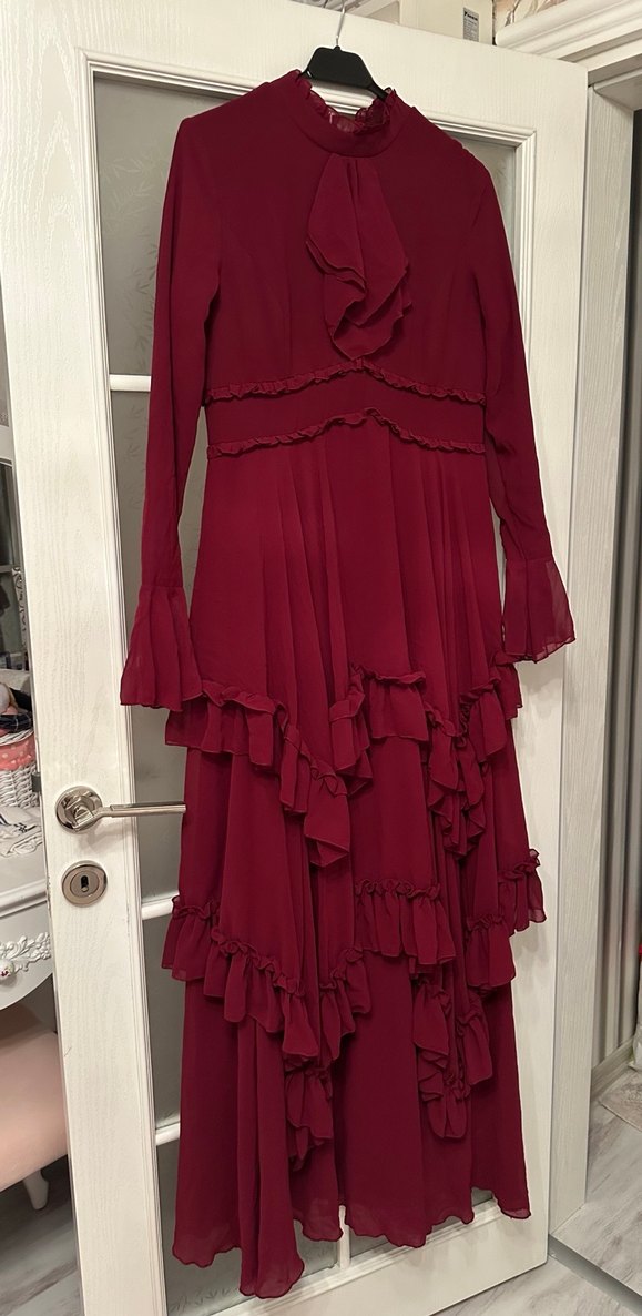 Bordo renk şifon elbise 1 kere giyildi boyundan tadilat yapılmadı siz ölçünüze göre yaptırabilirsiniz kalıbı dardır 40 beden tercih edebilir.