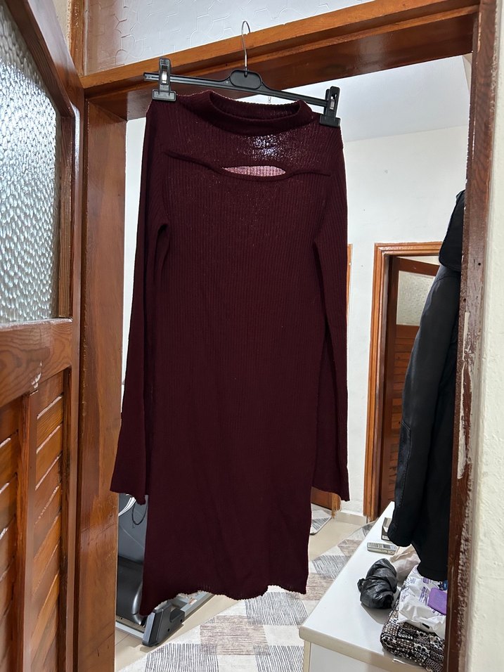 Bordo renk, uzun kollu ve yüksek yakalı bu triko elbise, yumuşak triko kumaştan yapılmıştır. Sokak stiline uygun, gündelik kullanıma elverişlidir.