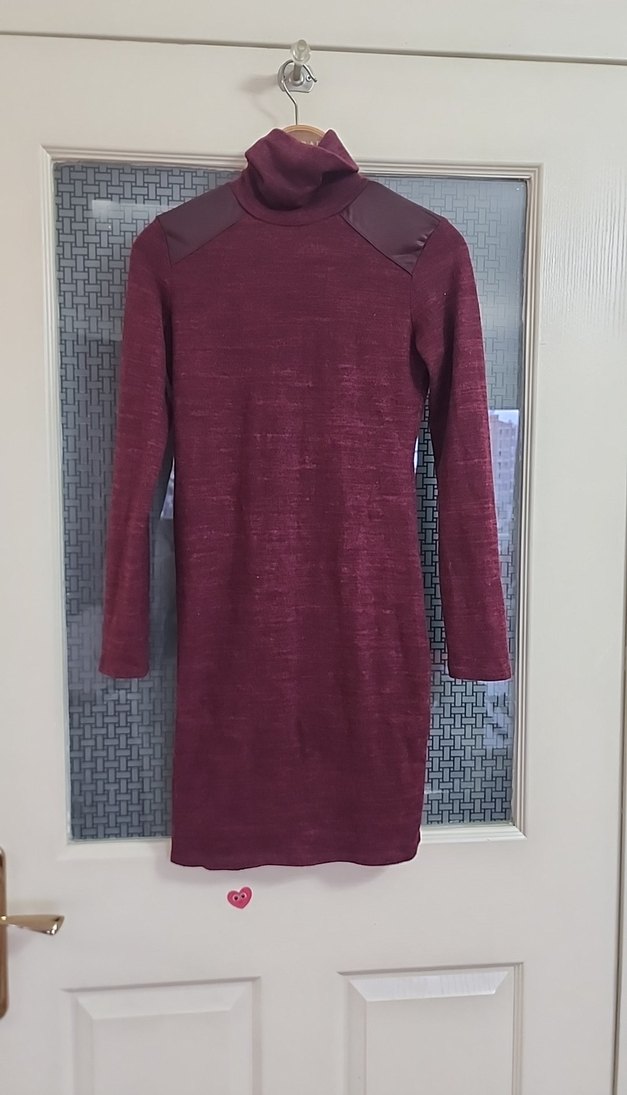 Bordo renkte, yüksek yakalı ve omuz detaylı, uzun kollu fitilli triko elbise, yumuşak sentetik kumaştan üretilmiştir, ofis kullanımı için uygundur. boy 85 cm iki kol arasi 35 cm esnektir