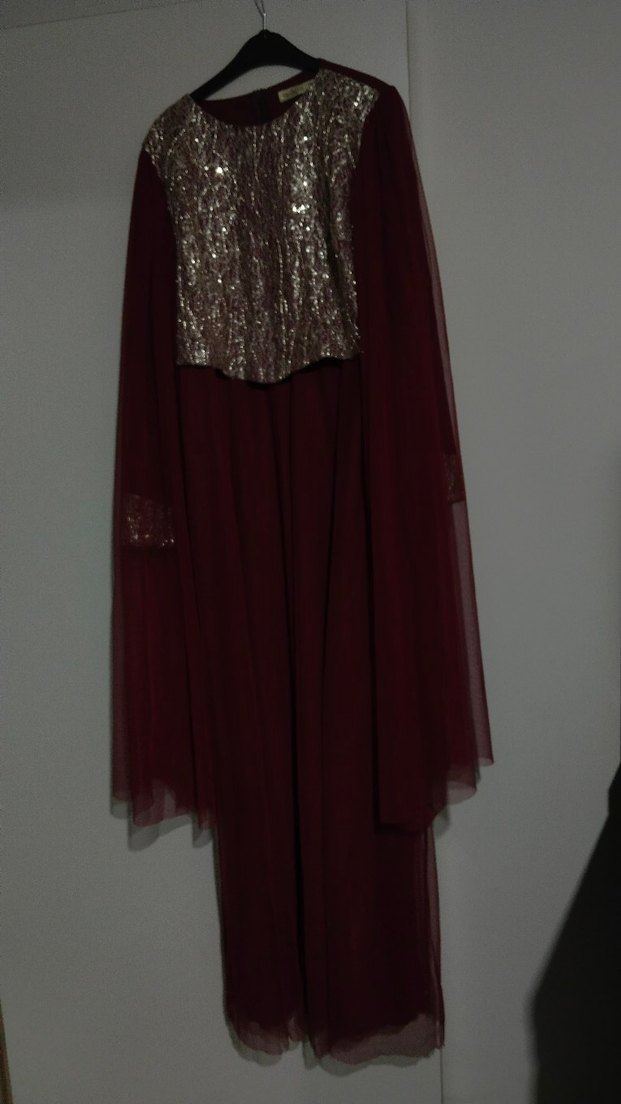 Bordo renkli, yüksek yakalı ve bol kesimli uzun kollu, drapeli gotik tarzda kadın abiye elbisedir. ✨