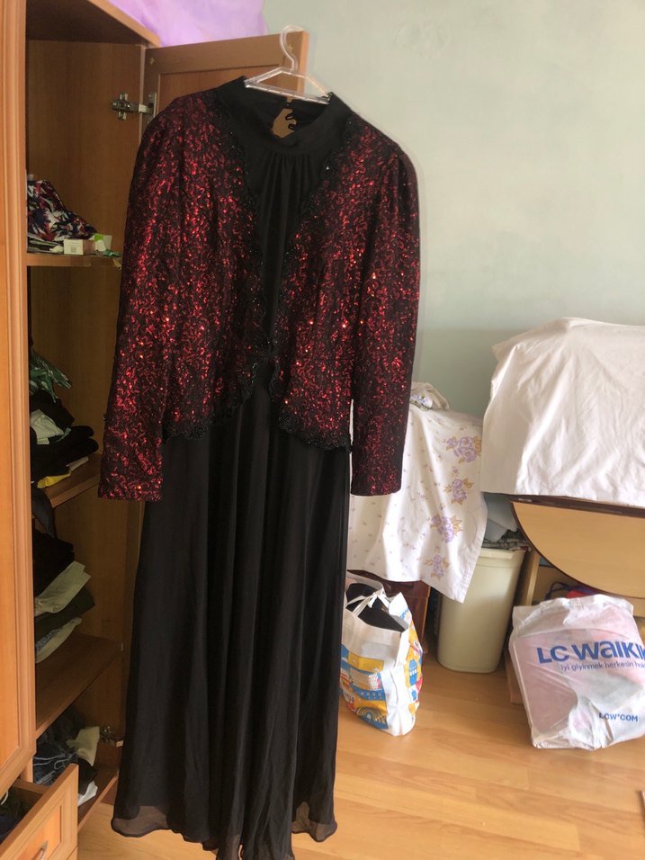 Bordo renkte uzun kollu, yüksek yakalı ve bol kesim gotik elbise. Drapeli detaylarıyla desenli kumaş, şık partiler için ideal.