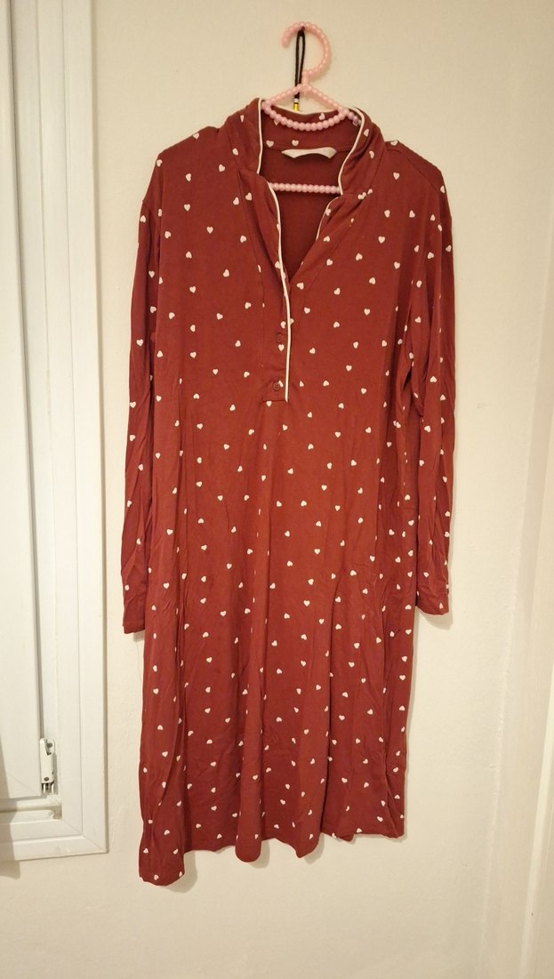 Bordo renk, uzun kollu, V yaka ve bol kesim hamile ve emzirme geceliği, küçük beyaz kalp desenleriyle süslenmiştir.
