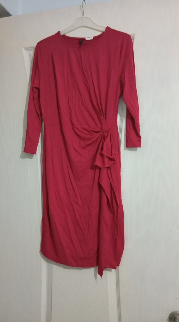 Bordo renk, uzun kollu, midi boy ve dar kesim hemşire elbisesidir. Yan tarafında şık bir büzgü detayı bulunur.
