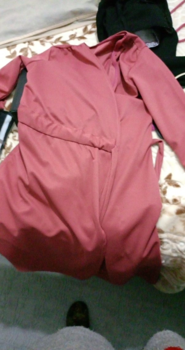 Bordo renk, uzun kollu ve oturan kesim hemşirelik sabahlığı. Yaka kısmı kesik ve askılı kollara sahip, desensiz ve rahat bir yapıda.