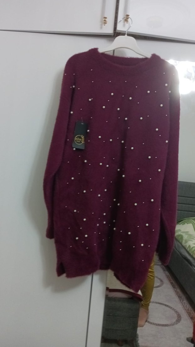 Bordo renk uzun kollu, bol kesim ve yuvarlak yaka, inci detaylı örgü triko kazak. Günlük rahat sokak stili için uygundur.