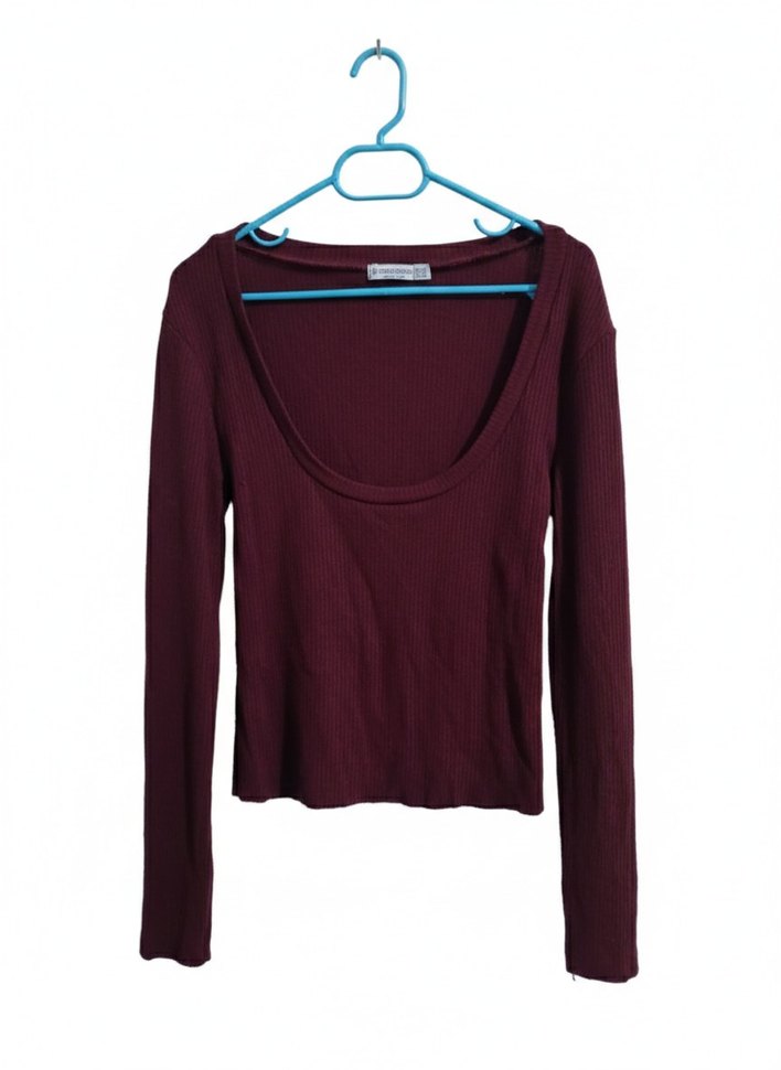 Bordo renkli, ince triko kumaştan, uzun kollu ve yuvarlak yakalı, günlük kullanıma uygun sade ve şık kadın kazak. Boy uzunluğu 50 cm , Göğüs altı 45 cm