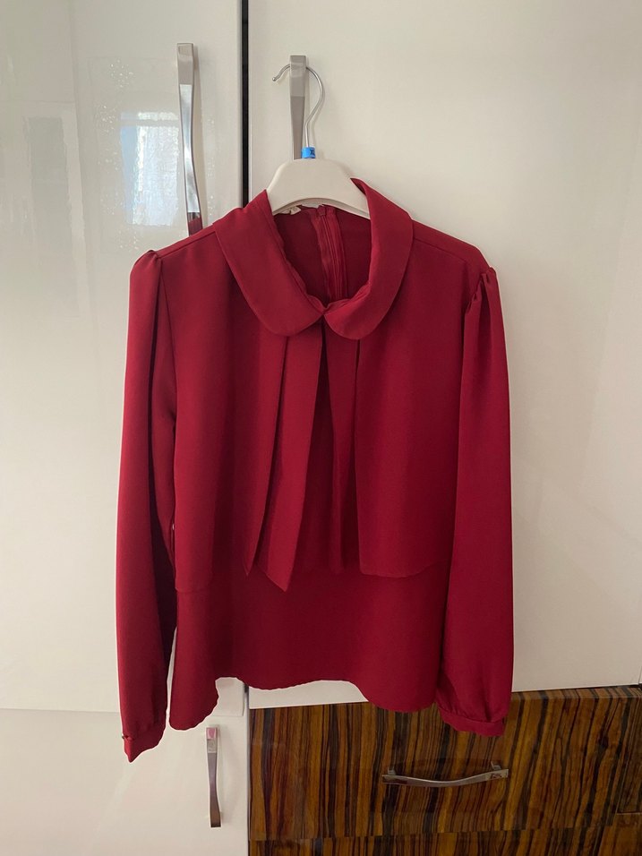 Bordo renkte, ipek görünümlü, yakalı ve uzun kollu, bol kesim ve drapeli bluz. Parlak ve desensiz yüzeyiyle ofis ve günlük kullanıma uygundur.