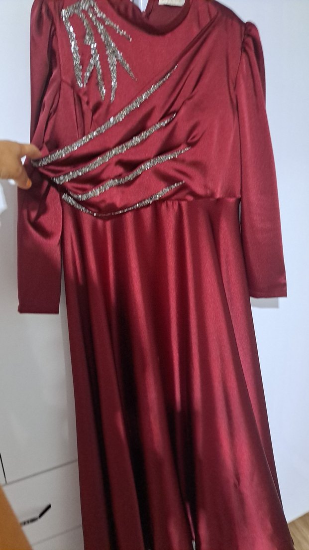 Bordo renkte, uzun kollu ve tekne yaka, drapeli ve işlemeli detaylara sahip, klasik kesim abiye elbise.