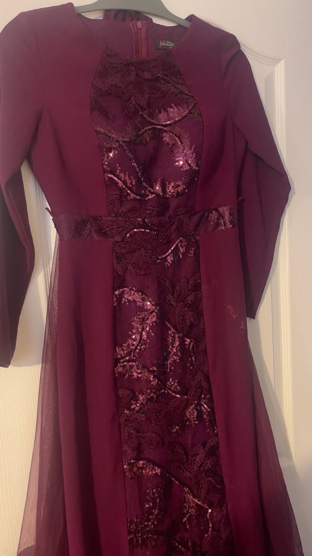 Bordo Uzun Kollu İşlemeli Abiye Elbise