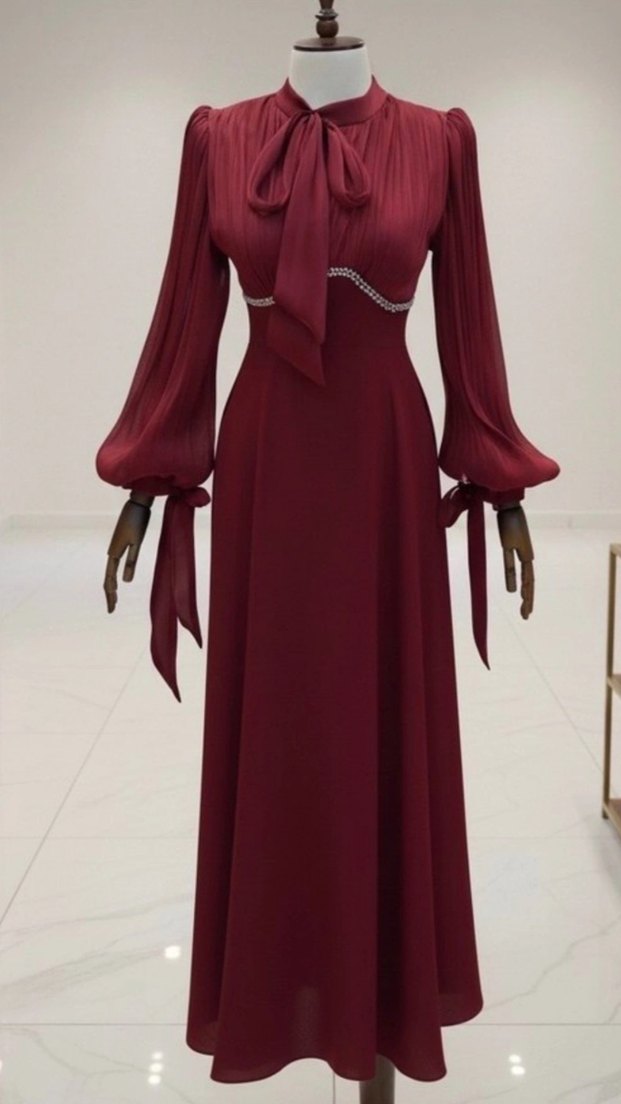 Bordo renkli, yüksek yakalı, uzun kollu ve işlemeli detaylara sahip abiye elbise şalıyla berabaer kiralıktır lrentdress Instagram adresinden ulaşabilirsiniz