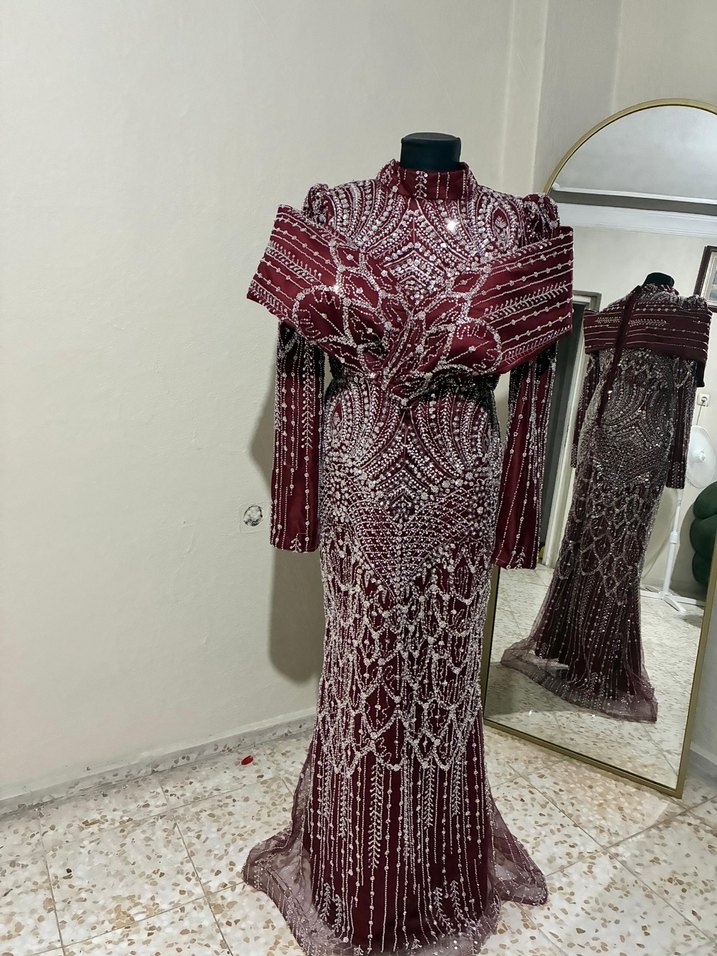 Bordo Uzun Kollu İşlemeli Abiye Elbise