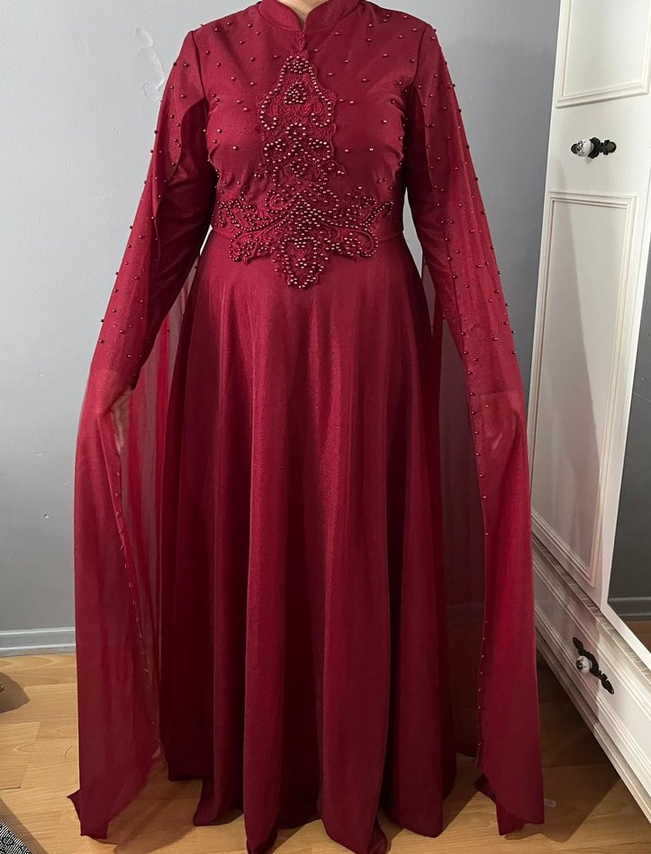 Bordo uzun kollu, yüksek yakalı ve işlemeli detaylara sahip, klasik kesim ve drapeli abiye elbisedir. Düğünler için uygundur.