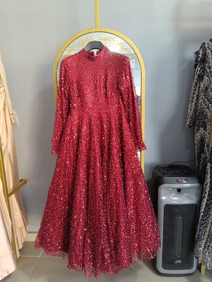 Bordo renkli, uzun kollu ve yüksek yakalı bu abiye elbise, sim ve işlemelerle süslenmiştir. Fitted kesimi ve parlak dokusuyla düğünler için uygundur. ✨