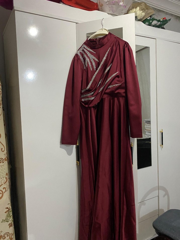Bordo Uzun Kollu İşlemeli Abiye Elbise