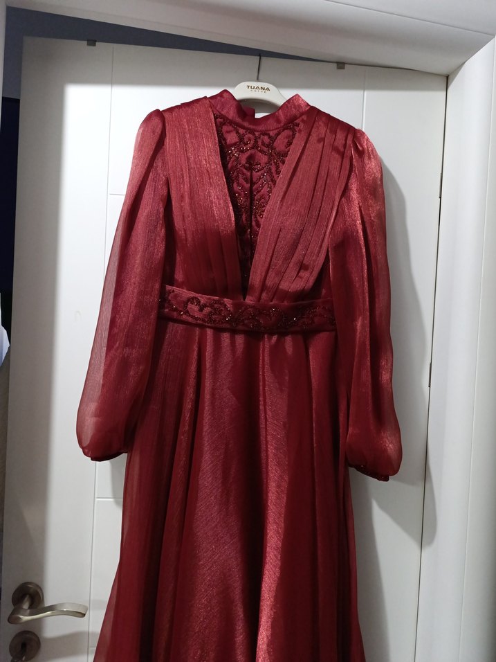 Bordo uzun kollu, yüksek yakalı, dar kesim abiye elbise. Parlak işlemeli ve drapeli detaylara sahip, düğünler için uygun. boy 160 cm göğüs 34 cm kol altından öteki kol altına ölçü 43 cm ölçülere dikkat ederek alım yapınız lütfen 2 kat astarlı ve tüllü ürün