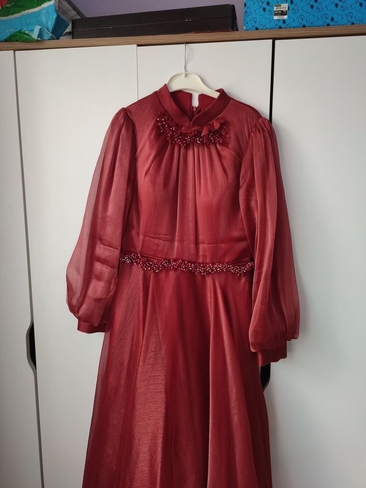 Bordo Uzun Kollu Kadın Abiye Elbise