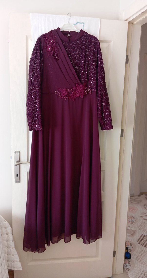 Bordo Uzun Kollu Kadın Abiye Elbise