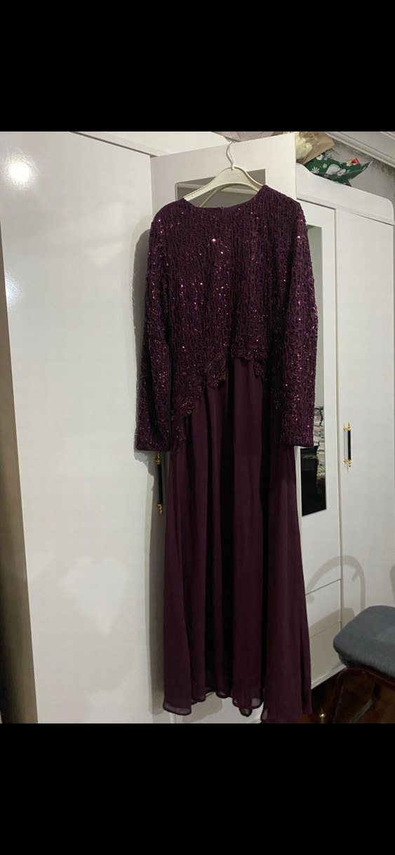 Bordo Uzun Kollu Kadın Abiye Elbise