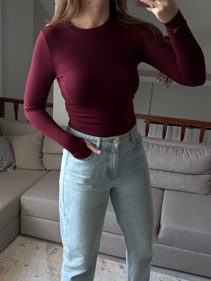 Bordo renk, uzun kollu ve bisiklet yaka kadın bluz, denim kumaştan olup günlük kullanım için uygun, rahat ve şık bir sokak stili sunar.