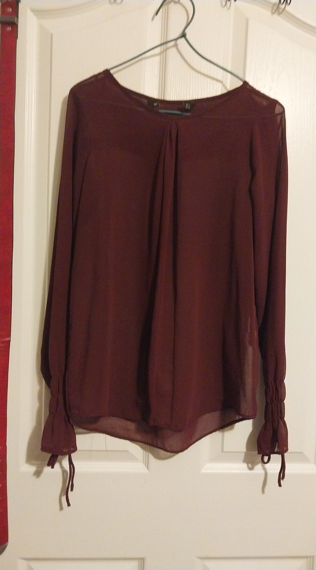 Bordo renkli, uzun kollu, yuvarlak yaka, bol kesim ve drapeli ipeksi kumaştan kadın bluz, ofis kullanımı için uygundur.