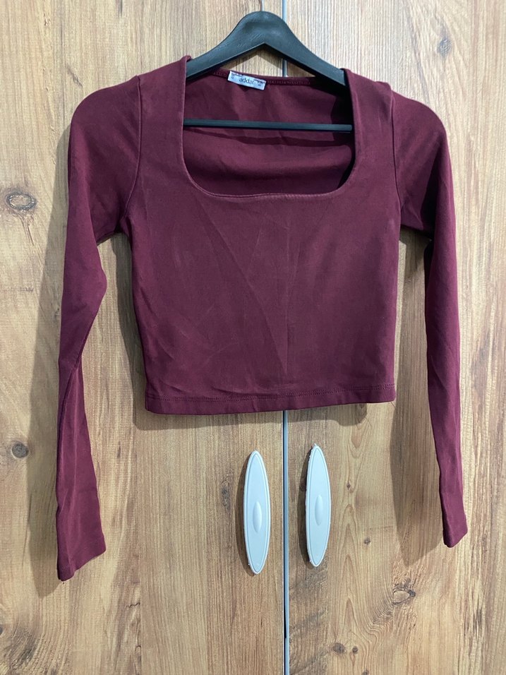 Bordo renk, kare yakalı ve uzun kollu, vücuda oturan kadın bluz. Rahat sentetik kumaştan, günlük sokak stili için uygun. L beden üründe hiçbir sorun yoktur.